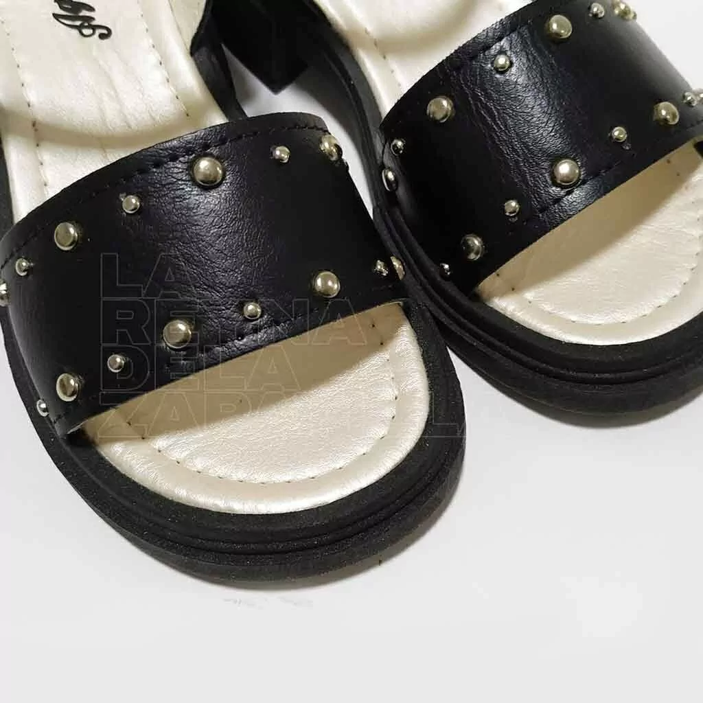 Sandalia de vestir con un pequeño taco de 2,5 cm. Capellada símil cuero con apliques tipo tachas. Suela EVA resistente a la abrasión con perfecto agarre en todas las superficies.