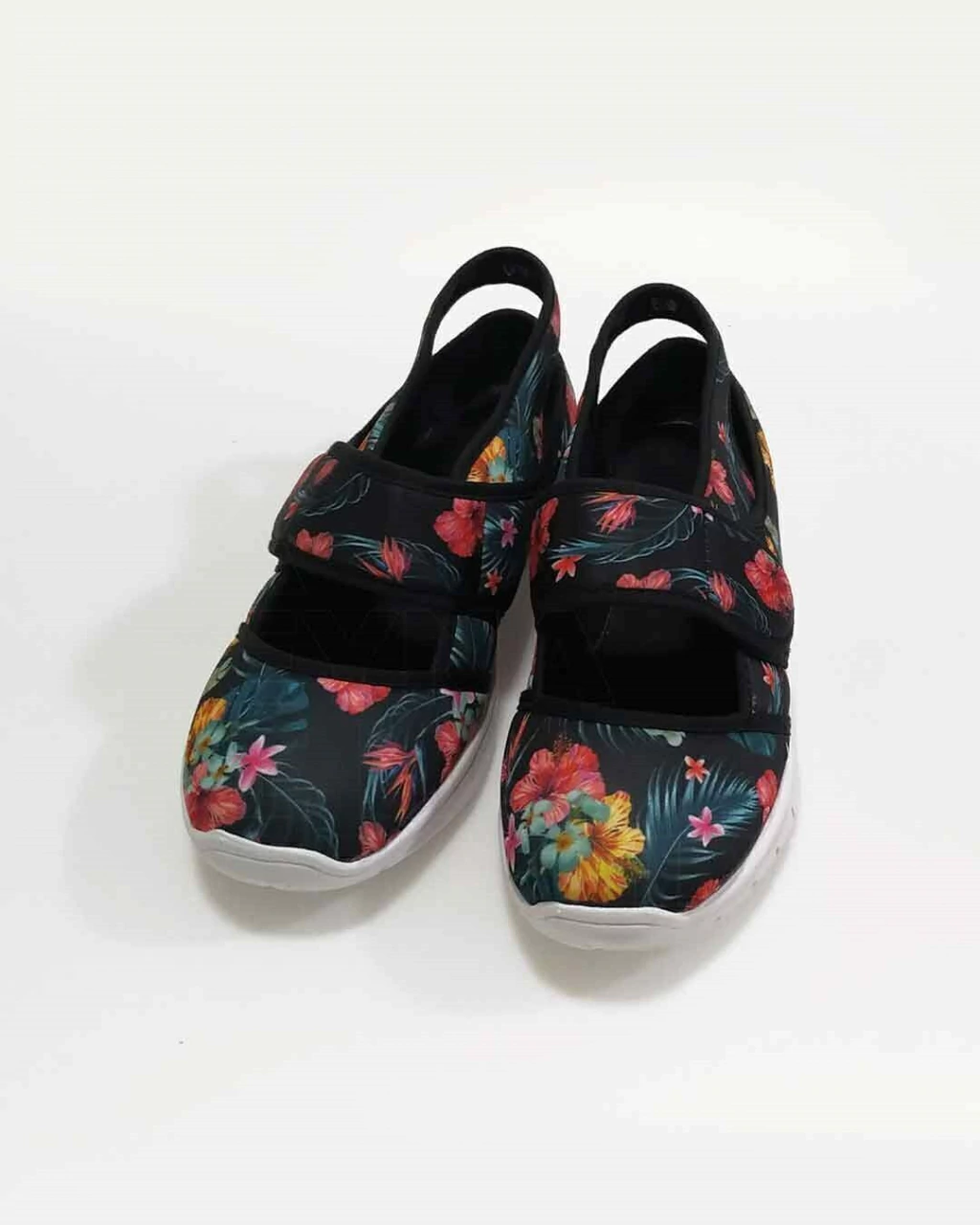 Capellada textil poliéster. Presilla con velcro para sujetar en el empeine y generar un practico calce, plantilla acolchada y una base compuesta por PVC liviano y antideslizante. Terminacion rigida y envolvente en el talón para hacer de este un calzado PERFECTO para el uso diario.