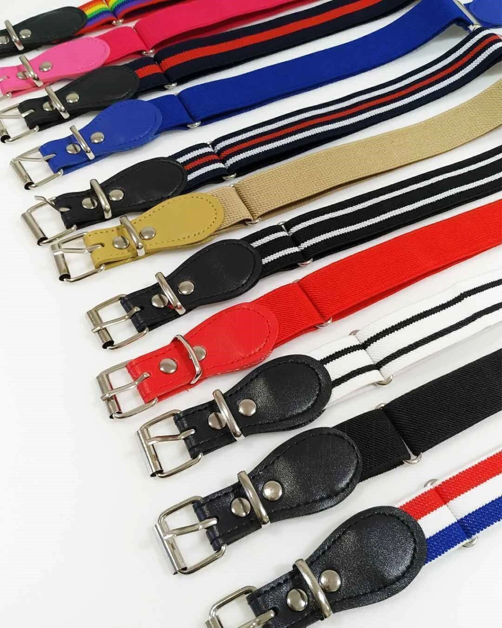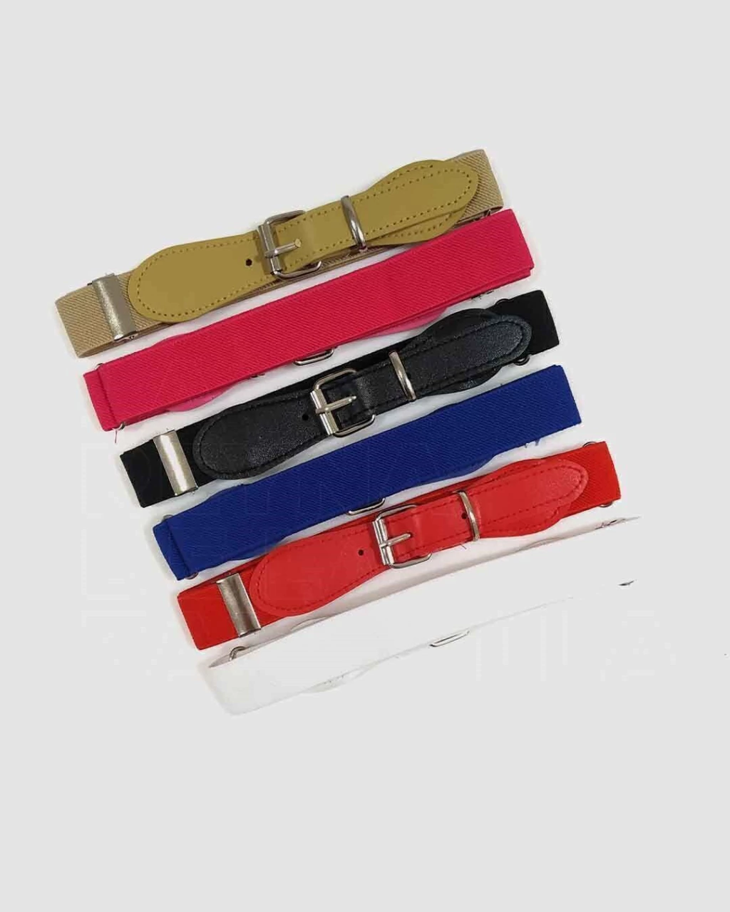 Cinturón elastico con ajuste en sintético. Realizado en una sóla pieza de 8 mm. de ancho y con puntera en corte. Cuenta con 6 agujeros para diferentes calces y presenta un detalle de pasador de cuero fijo.