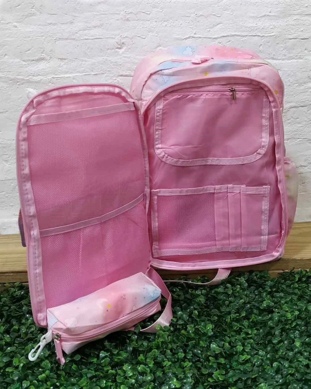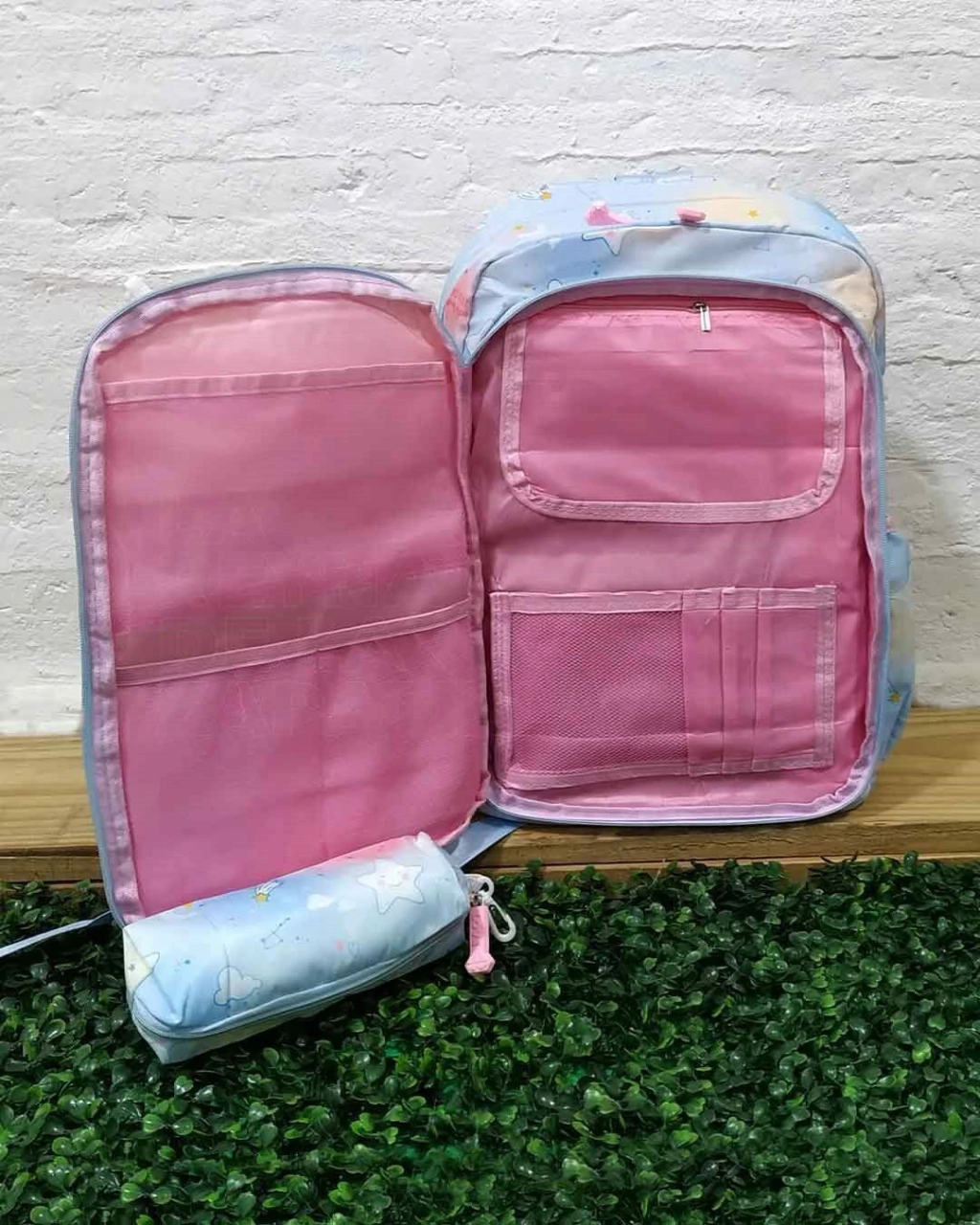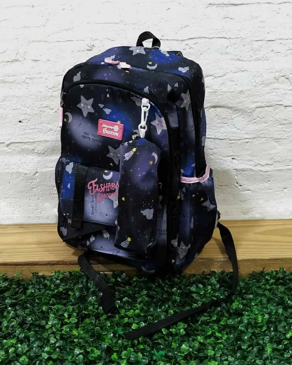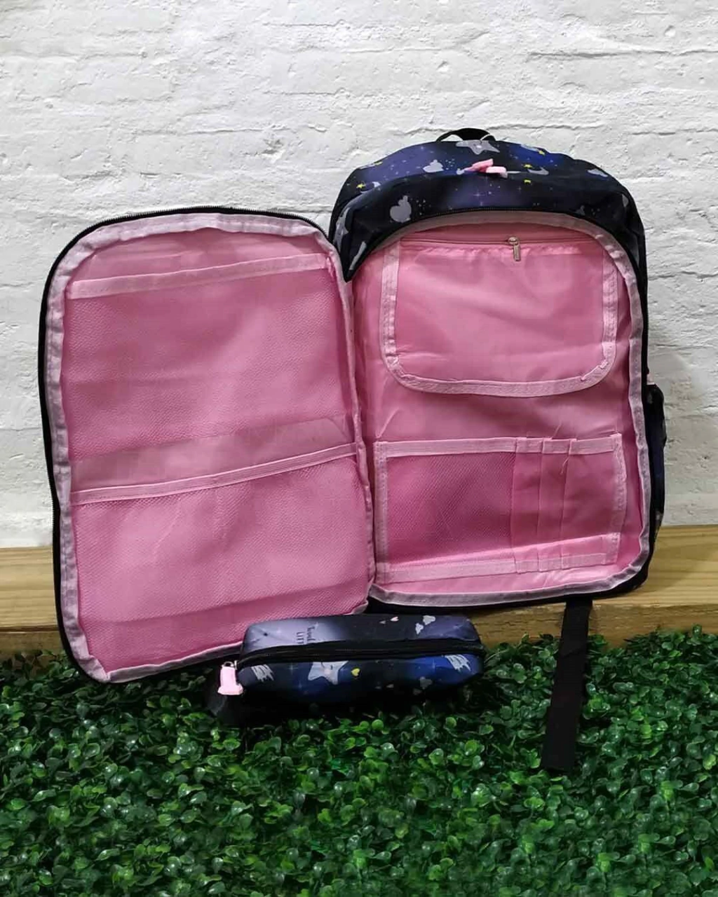 Dispone de un compartimento principal con bolsillo porta notebook, un bolsillo grande con organizador tipo cartuchera, un bolsillo frontal pequeño, dos bolsillos laterales abiertos, ideales para llevar botellas y una cartuchera extra.